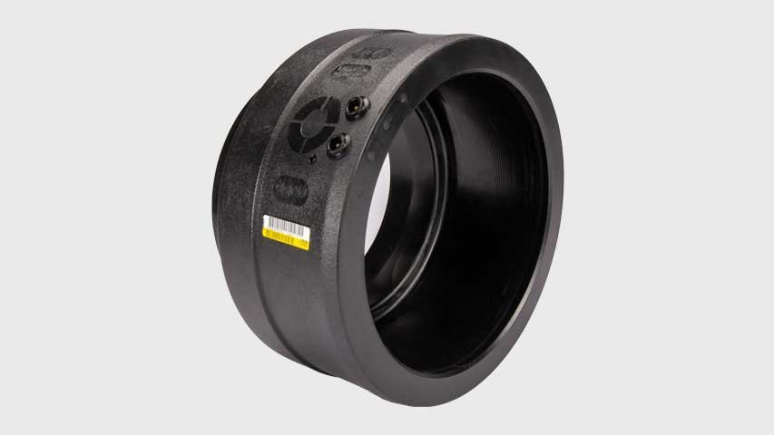 The induction e-socket consists of a metal ring which is overmoulded using PE or PP. The ring inductor is an electrical coil that generates a magnetic field. Inductive heating causes the plastic in the welding zone to plasticise and joins the pipe to the e-socket.